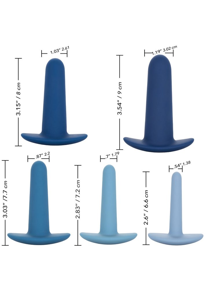 Immerse yourself in the sensational world of anal stimulation with the They-Ology 5-Piece Wearable Anal Set from CalExotics. This unique set includes a set of 5 wearable anal training pegs that allow you to safely and comfortably increase pleasure with every use. In order to enjoy all that the exciting world of anal play has to offer, training is to ensure complete safety and satisfaction. Each pin in the set gradually increases in length and girth for superior enjoyment at any level of gaming enjoyment. With a unique wearable design, each pin is finished with a flexible flanged base for comfort, easy mobility and ease of use. The flexible pegs are made of smooth seamless premium silicone. This body-safe material is fragrance-free and phthalate-free to keep your most sensitive areas happy and healthy.