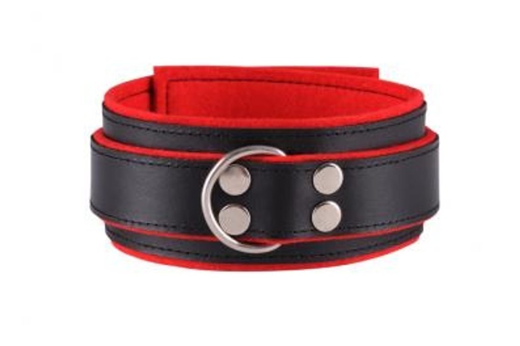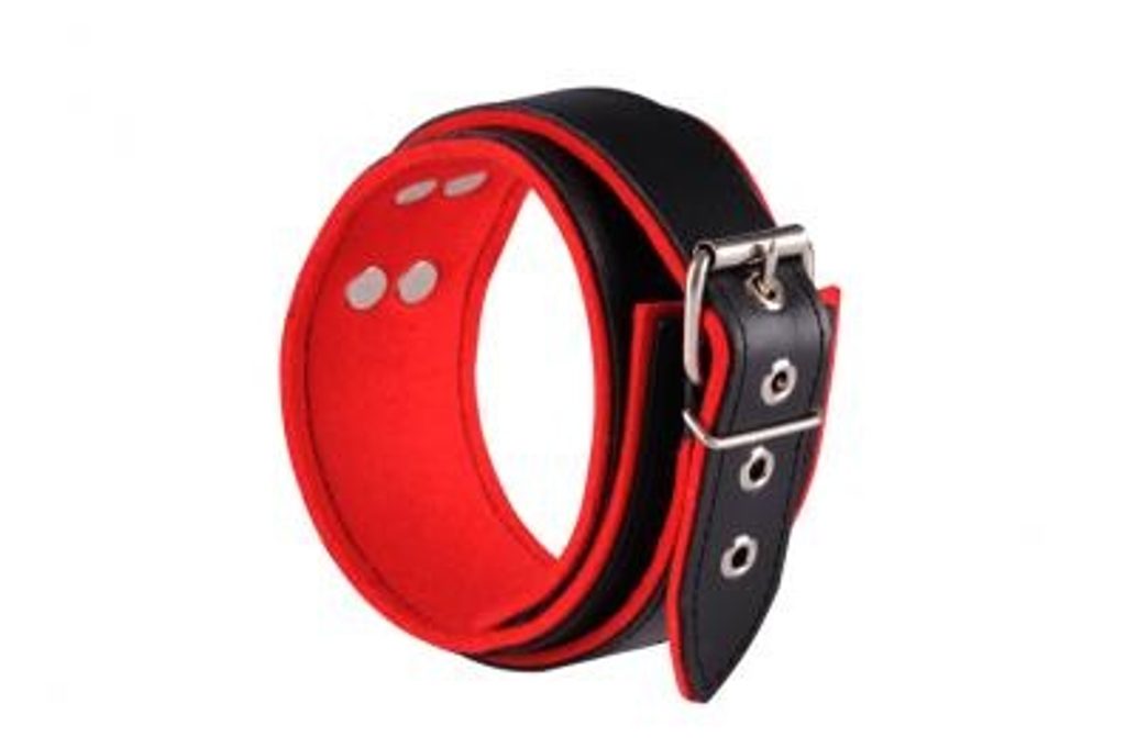 Massive black-red leather collar. The collar has an adjustable size and a guide can be used.