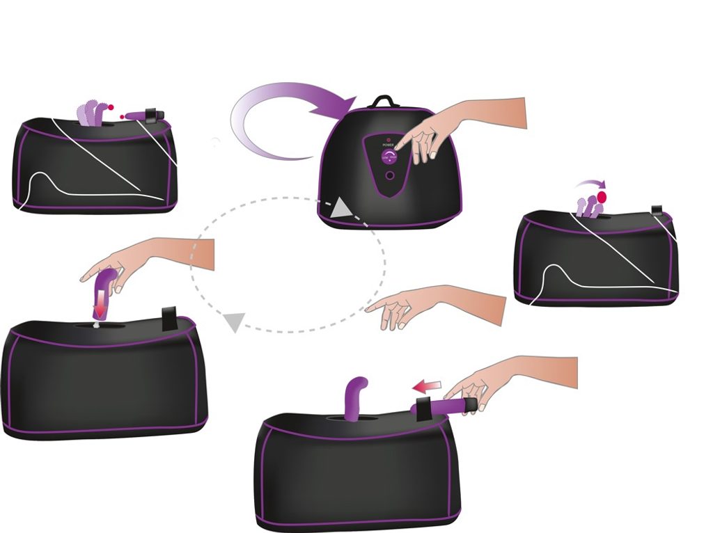 Black sex machine with two different attachments and an attachable vibrator for further stimulation. Continuous regulation of rotational movement for targeted massage of the G-spot or prostate in men.