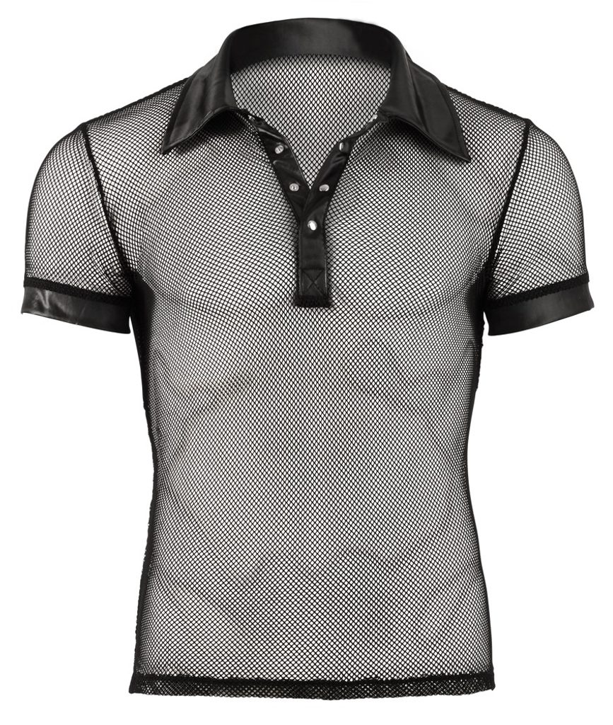 This men's polo shirt draws attention with its seductive combination of sheer mesh and glossy wetlook material. It features a polo collar and press-stud fastening that stops at the chest, naturally highlighting the upper body and creating a provocative appearance.