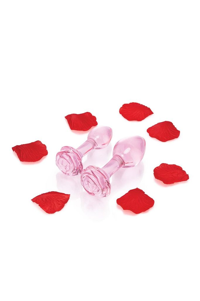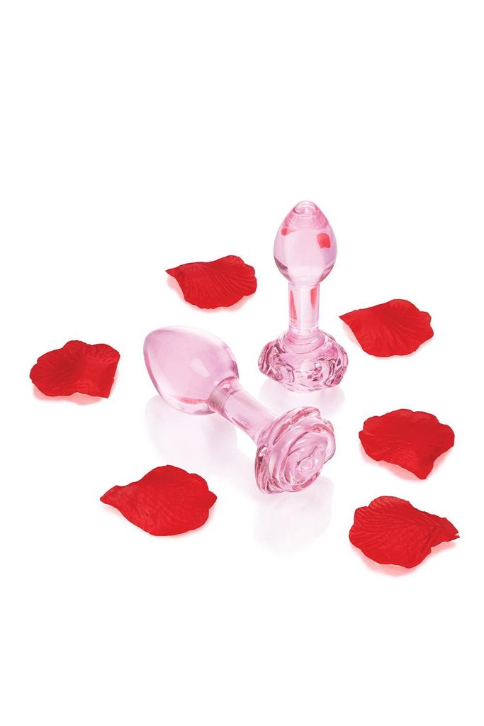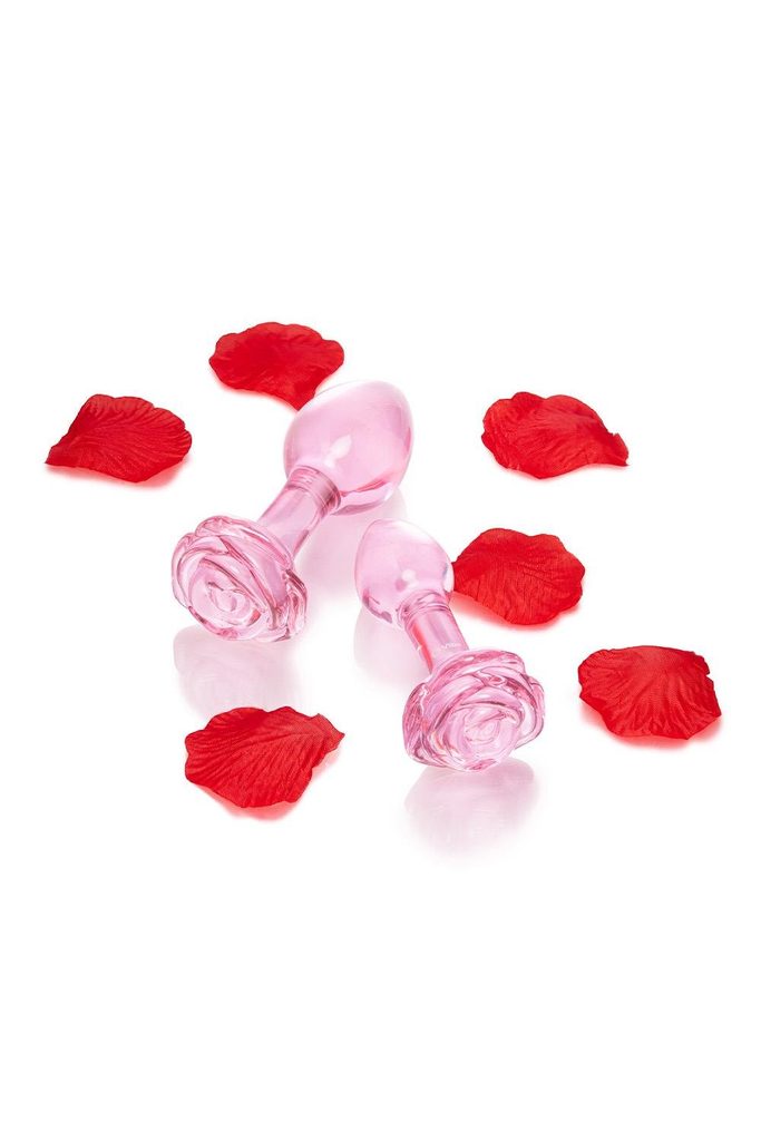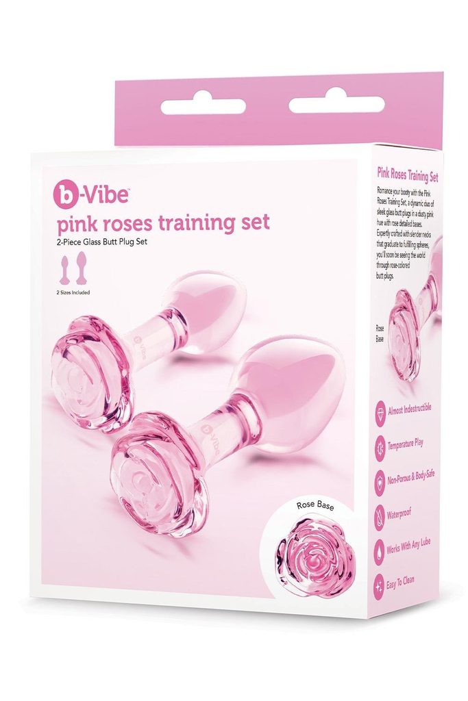 Pink Roses Glass Butt Plug Training Set Romance your booty with the new b-Vibe Pink Roses Glass Butt Plug Training Set – a dynamic duo of elegant glass anal toys in a dusty pink shade with rose-detailed bases. Expertly designed with slender necks that expand into fulfilling spheres, these plugs let you see the world through “rose-colored glasses” – or rather, rose-colored butt plugs.